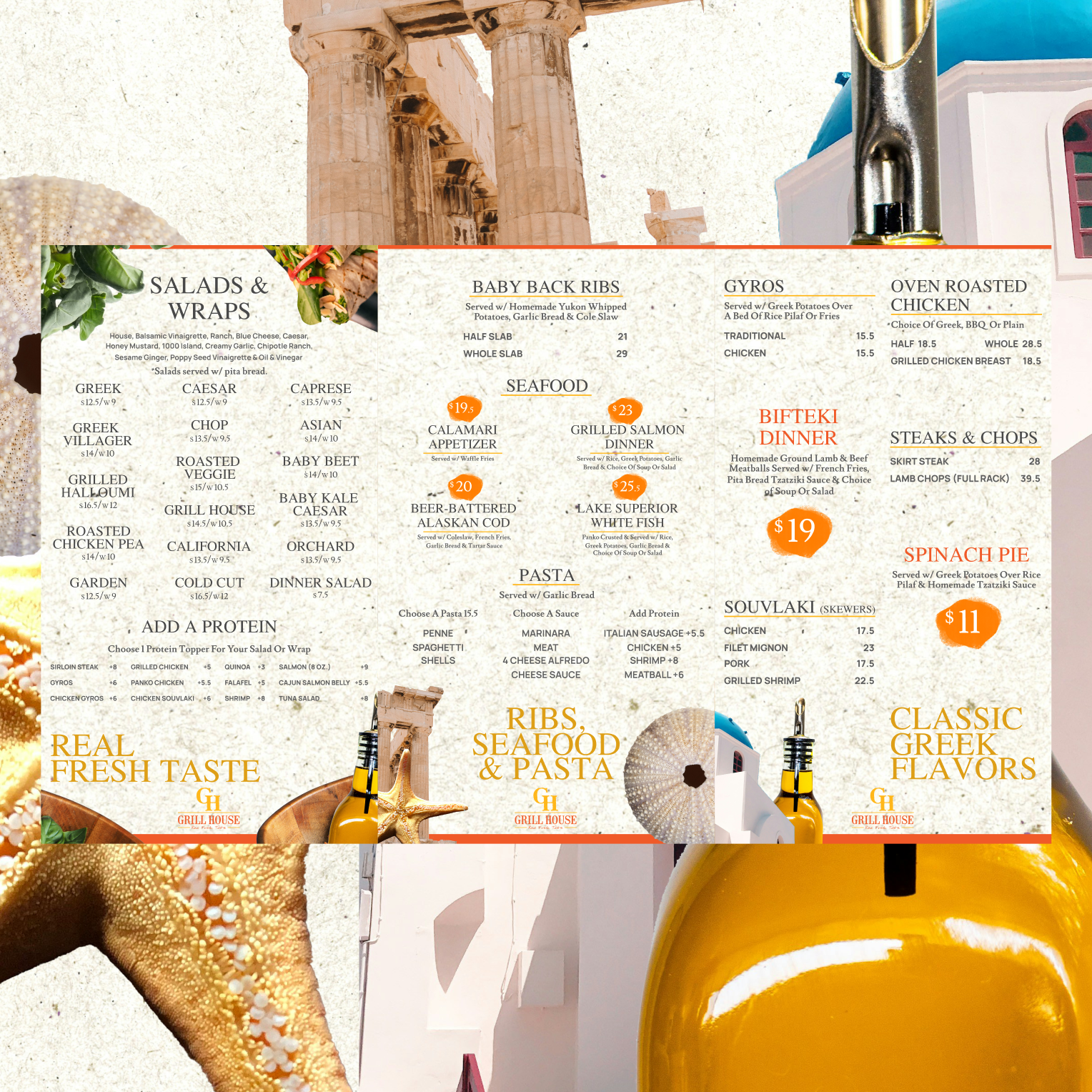 Grill House is a Greek restaurant in Chicago’s northern suburbs. The menu focuses on fresh Mediterranean flavors. Casual and approachable.