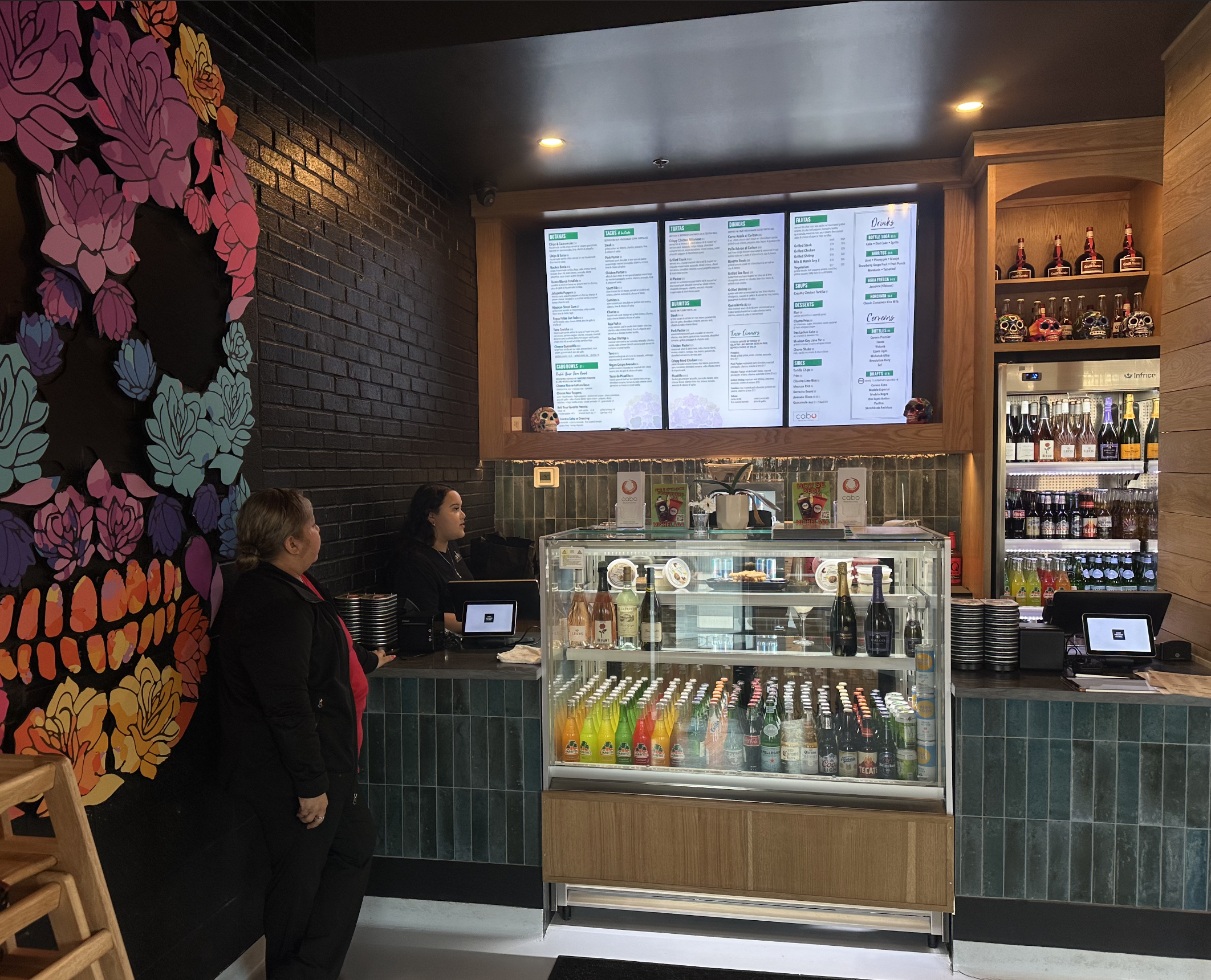 It was a Mexican restaurant called Cabo and their host stand was inside the restaurant and there were 3 wall-hanging TV’s behind them that had menu’s on them.